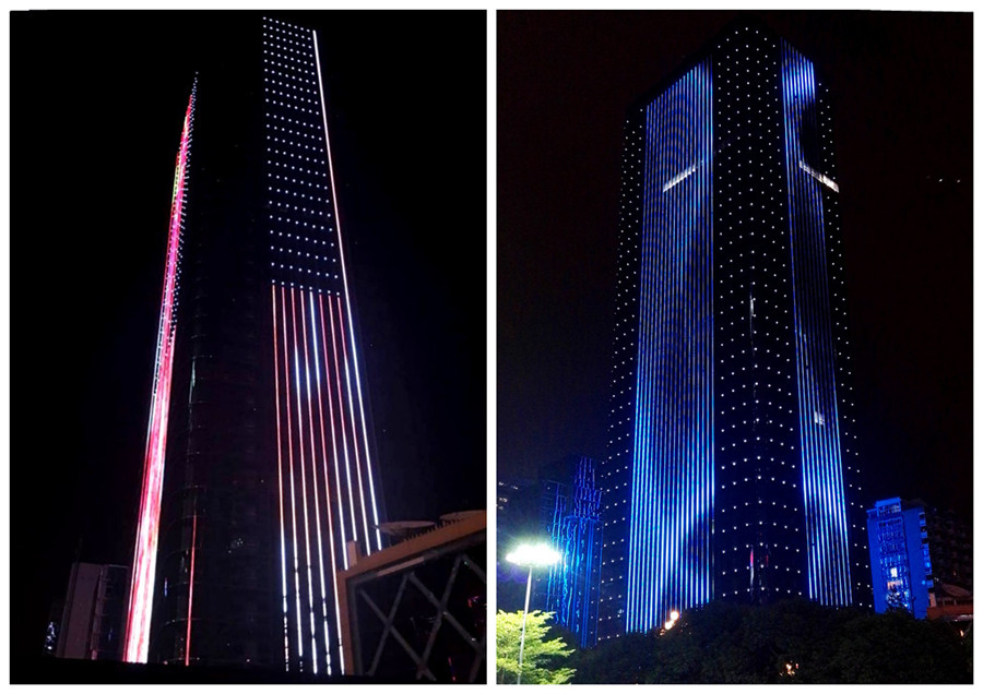 海西商務大廈泛光照明工程采用杭州G20峰會主會場使用的“晶日照明”品牌燈源,運用了目前國內最先進生產技術,具有防撞、防曬、防水、防雷等功能,在設計上運用了節能環保理念,采用了LED形式,比普通燈源省電20%-30%。泛光照明效果完美結合了大樓簡潔、大方的建筑風格。主樓四個面共采用8700條線光源作為主要光源,運用智能化控制編制出一幕又一幕精美的畫面,呈現出視覺“盛筵”。四個轉角共采用1020個點光源作為輔助光源,模擬星光閃爍的視覺效果。泛光照明工程調試工作順利完成,達到設計預期效果,成為福州五四路上一道最靚麗的風景線。