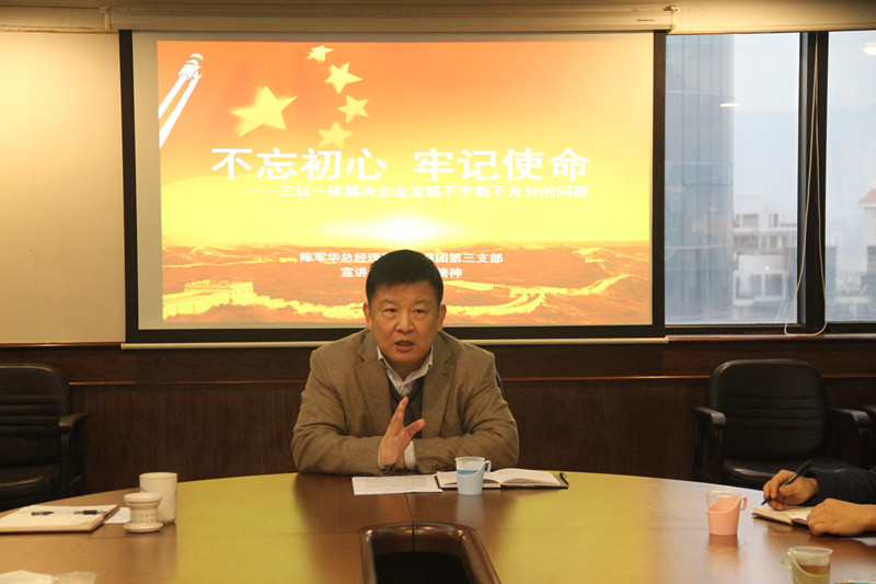 2017年12月18日下午,集團黨委副書記、總經理陳軍華深入所在機關第三支部宣講十九大精神,陳軍華總經理圍繞“不忘初心,牢記使命---三位一體解決企業發展不平衡不充分問題”主題上專題黨課,機關第三支部全體黨員干部和財務部、審計室員工參加了此次學習。